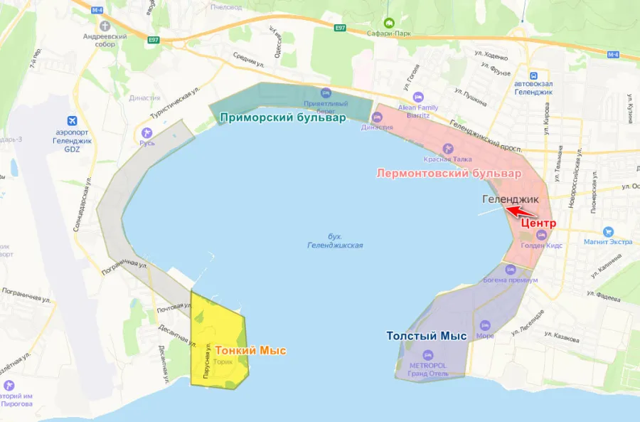 Так, сразу уточним, что оценивать место проживания в Геленджике мы будем с точки зрения туриста, так как в таких курортных городах как Геленджик выбор места для проживания во время отпуска, как правило, имеет мало общего с выбором места для постоянного проживания. Ну и еще отметим, что рассматривать мы будем ближайшие к береговой линии районы, как наиболее удобные и востребованные отдыхающими.