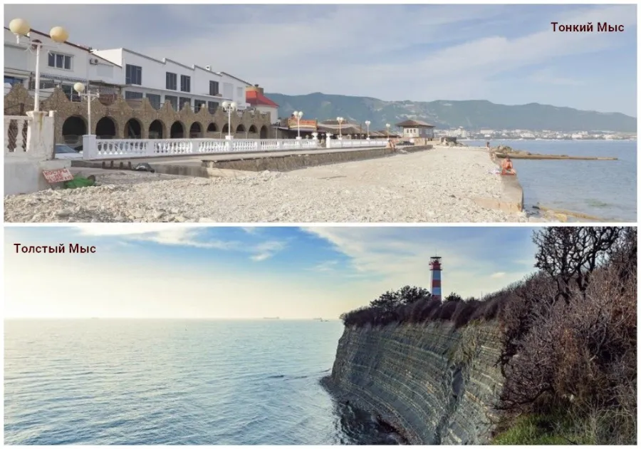 Геленджикскую бухту трудно спутать с другими прибрежными городами, она максимально закрыта от открытого моря двумя выступающими мысами: Тонкий мыс и Толстый мыс. Незамысловатые названия происходят от высоты берега над уровнем моря. Не трудно догадаться, что Тонкий мыс представляет собой плоскую береговую линию, а Толстый мыс - практически отвесная известковая скала, которая местами возвышается почти на 20 метров над морем.