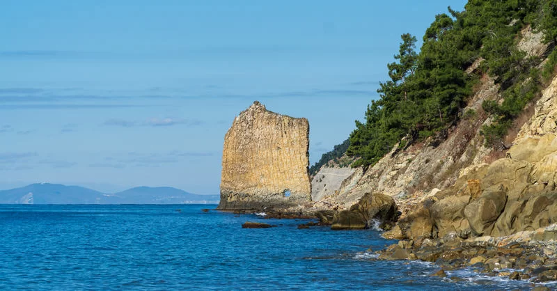 Вспомнили? Так вот, эта интересная скала находится совсем неподалеку от Геленджика. Но если вы рассчитываете приехав сюда сразу же ахнуть от впечатлений, то вас ждет некоторое разочарование. Перед вами будет довольно пустынный пляж и где-то справа виднеется сама скала. Добраться до нее по большим камням довольно проблематично, я уже говорил об этом, но возможно. Многие из страждущих привозят отсюда неплохие фоточки, позируя в проеме скалы.
