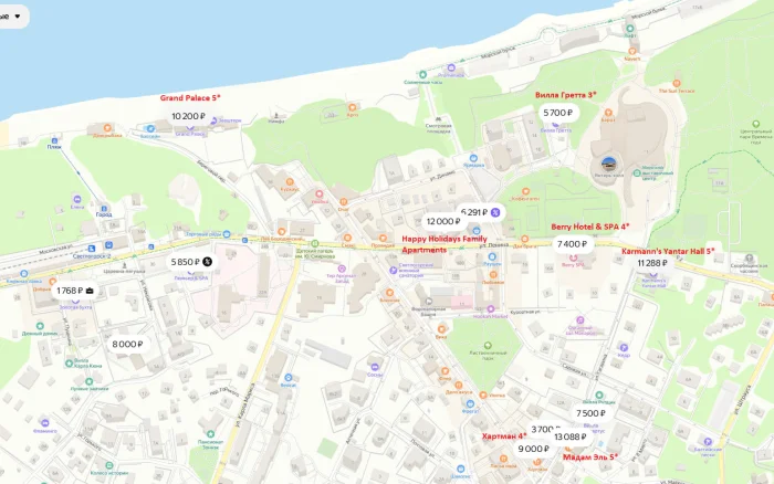 Мы уже обсуждали и даже указывали на карте города район, который интересен туристам. Как раз-таки самые лучшие гостиницы расположены в границах курортной зоны, посмотрите на скриншот карты отелей в центральной части города. Самые популярные отели выделены текстом. Ссылку на сервисы бронирования, где можно посмотреть наличие свободных номеров и стоимость проживания вы найдете ниже.